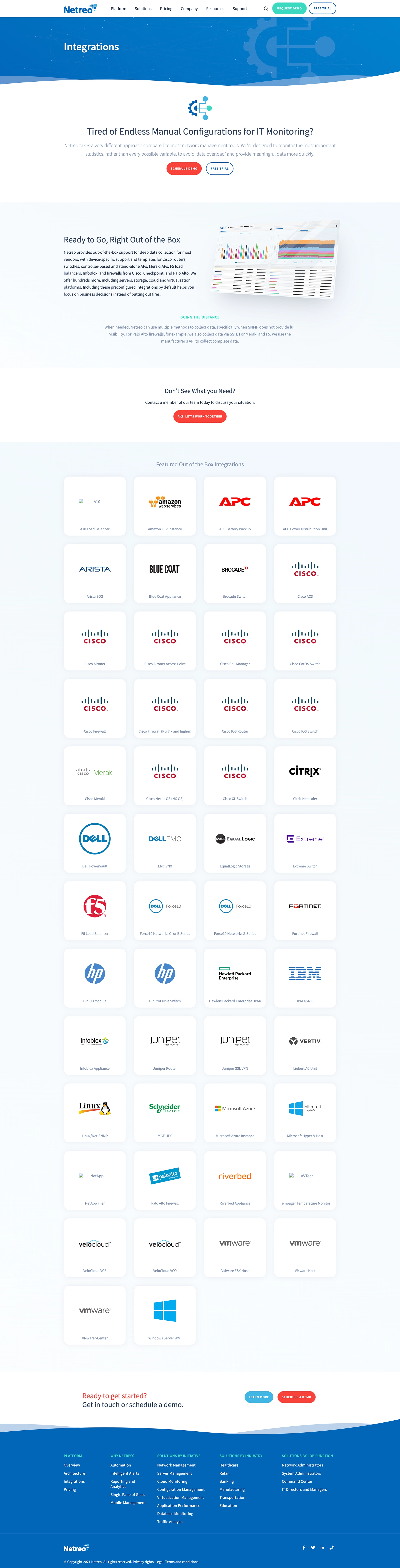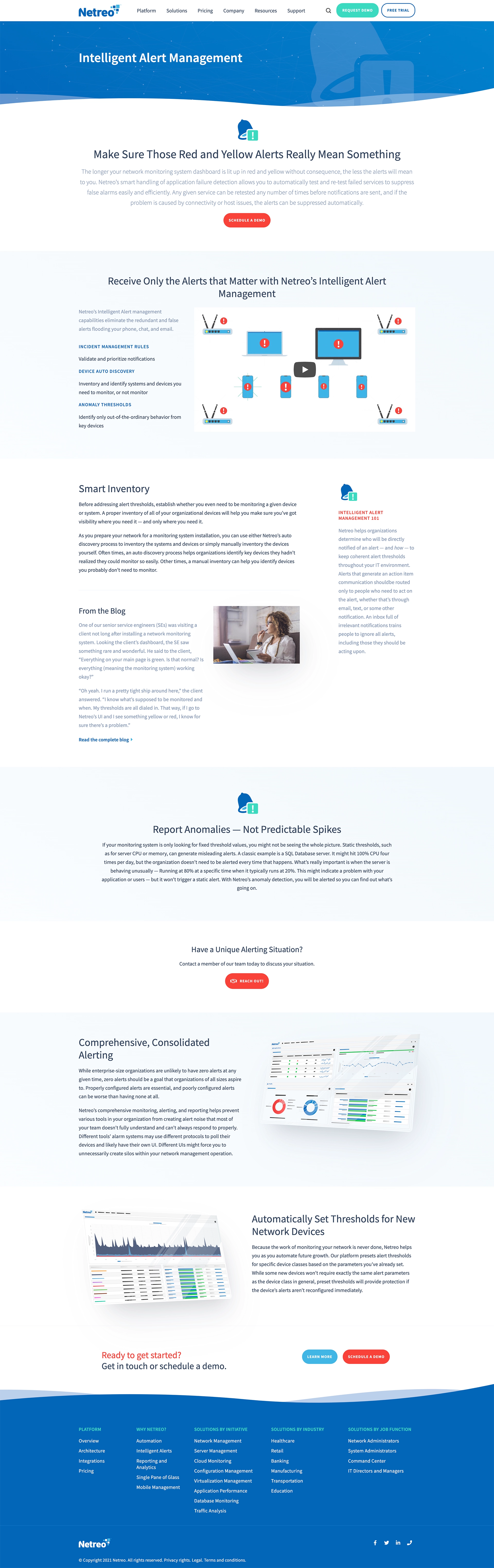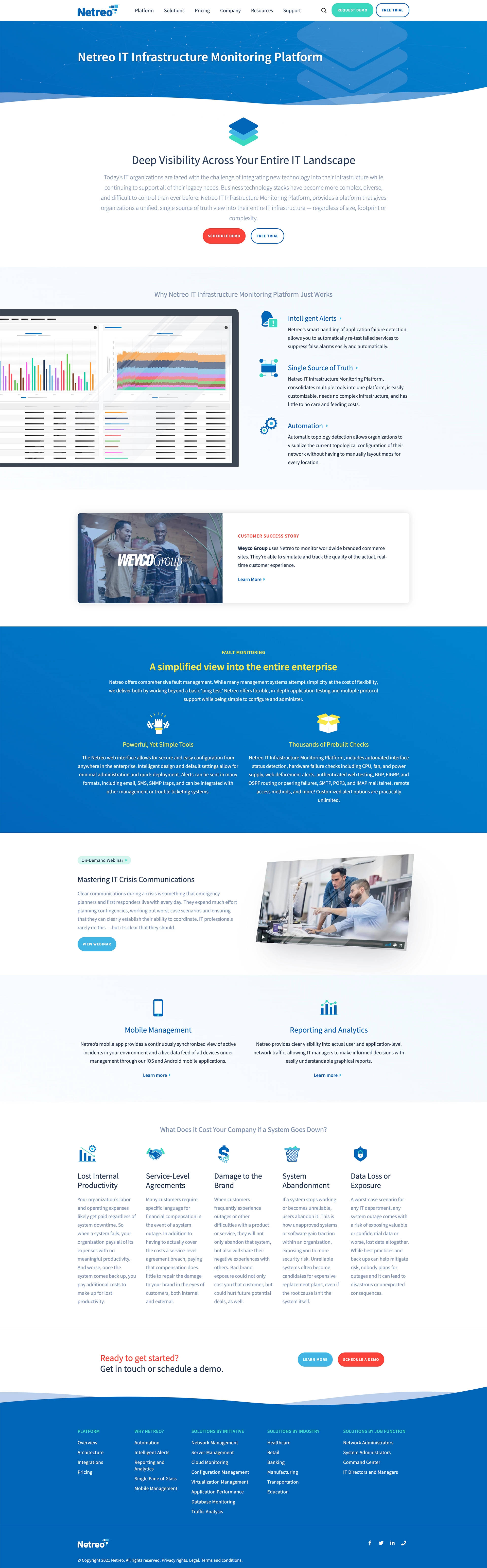 The Netreo website was a complete rebuild, from design and structure to content and code. While some of the original site's architecture for products and solutions carried over, nearly everything else started fresh, including the theme and copy.